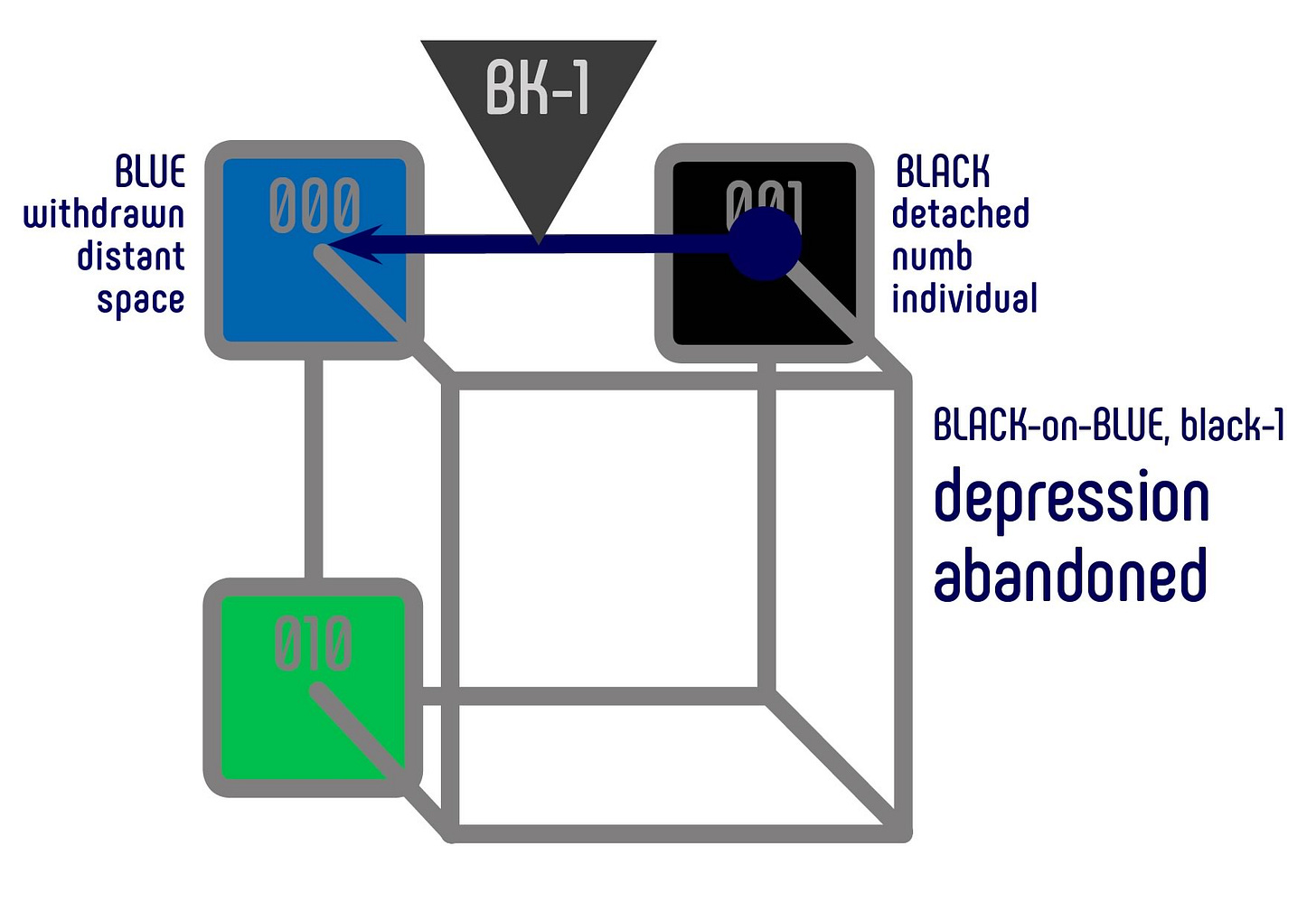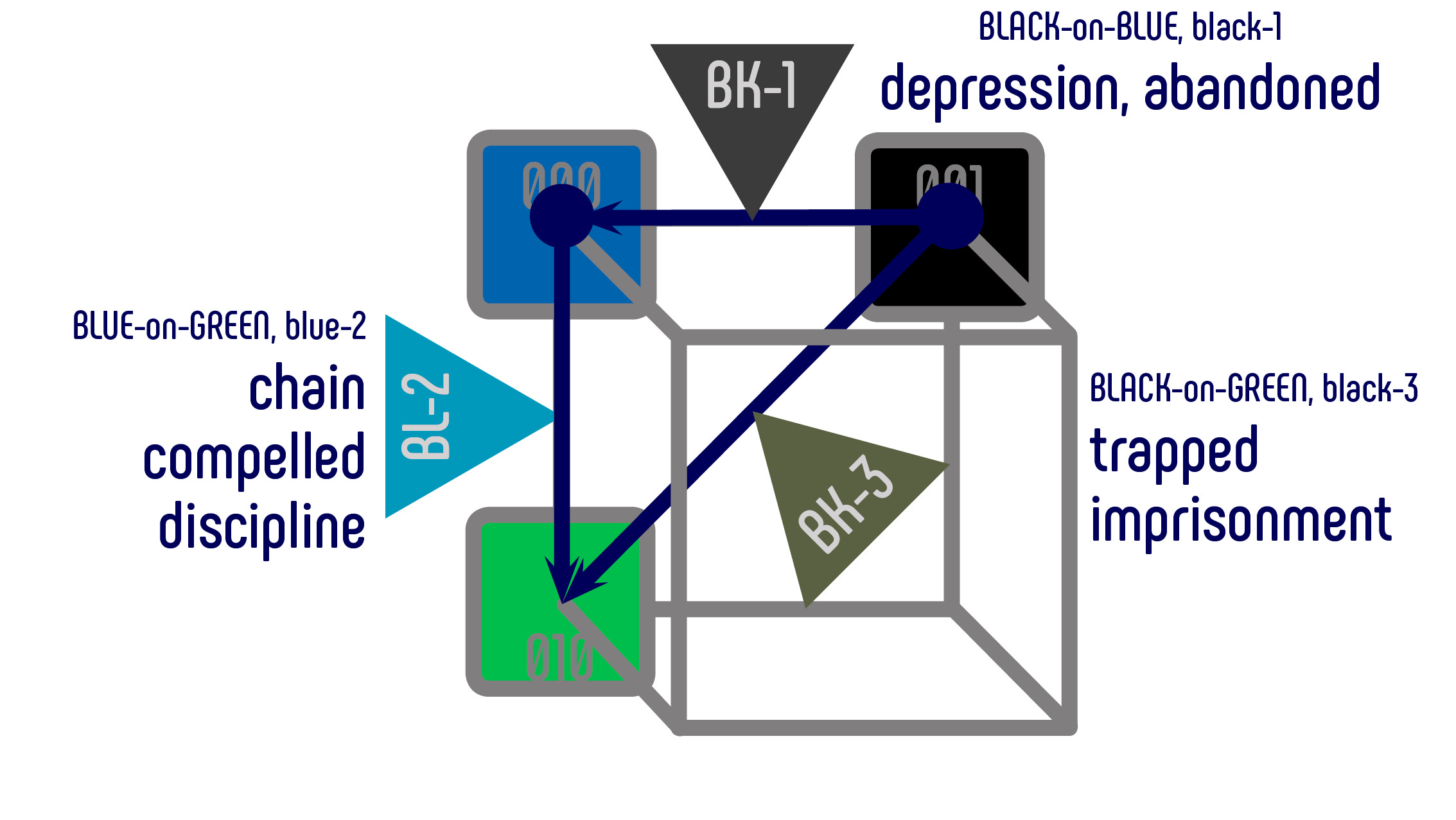 When the emphasis of isolation is placed on the feeling of utter abandonment as a mode of a depressed mental state, the color combination black-on-blue and the semantically associated hue dark gray (black-1) are frequently used in visual communication.
