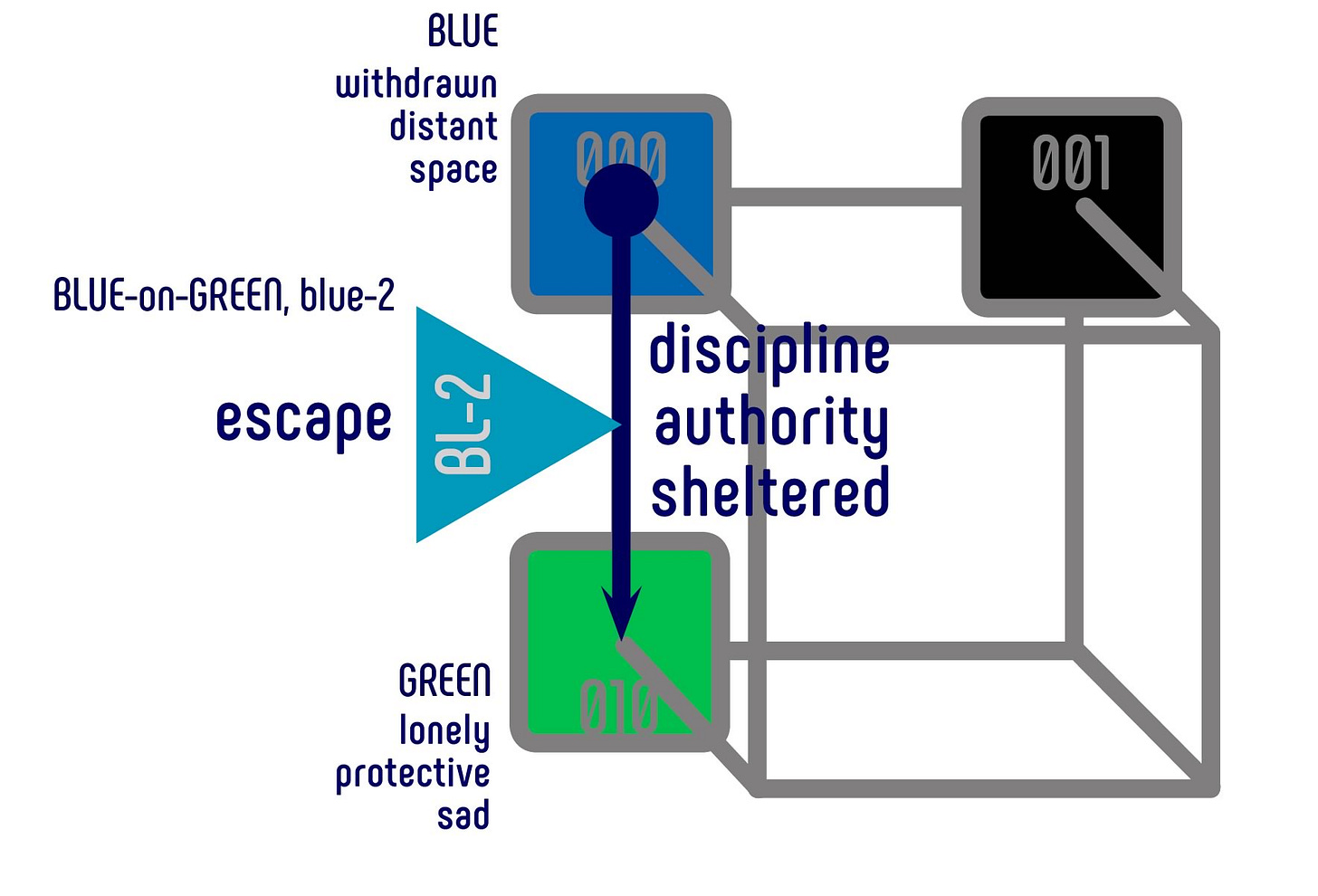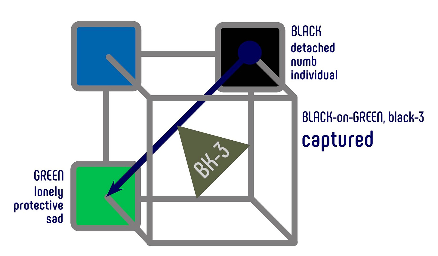 The colors blue, green and black are the most commonly used in visual communication depicting isolation and loneliness. In the Semantic Color Space, these three primary colors are all located at the back. In the depth dimension, this suggests a meaning with a strong focus on the inner world of thought.